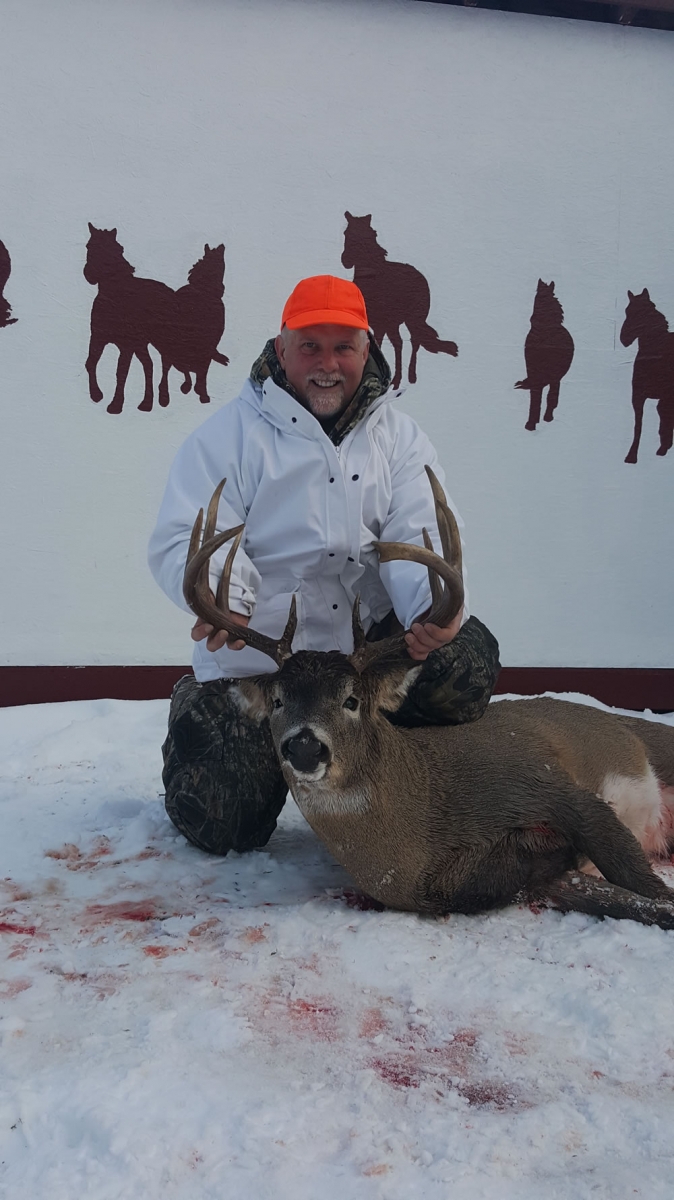 Hunters sit either in ground blinds or elevated box blinds, overlooking active baits. Once the agricultural crops in the area have been harvested, the deer move into the bush 24/7, and these bait sites become a big food source, especially when snow covers the forest’s natural forage and cold temperatures force the deer to feed more. It is not uncommon under these conditions to see 10-15 deer per day, including numerous bucks.